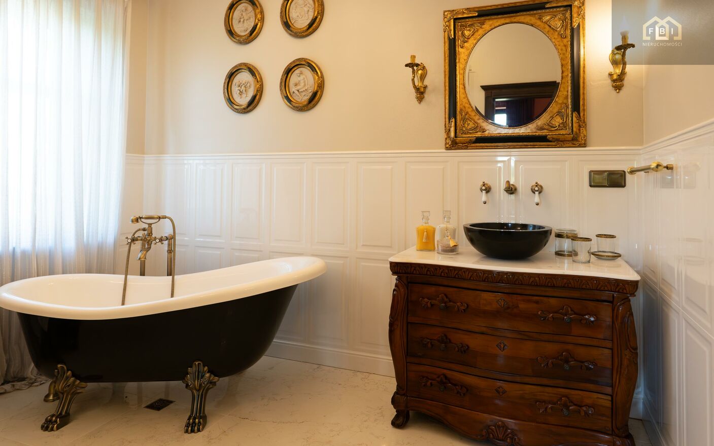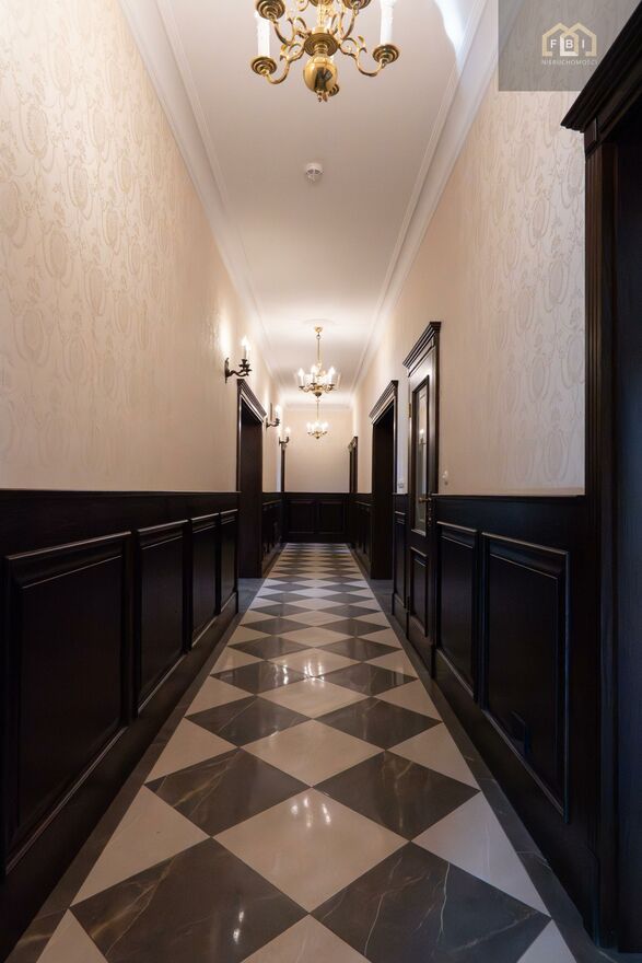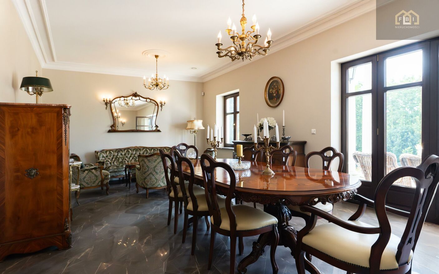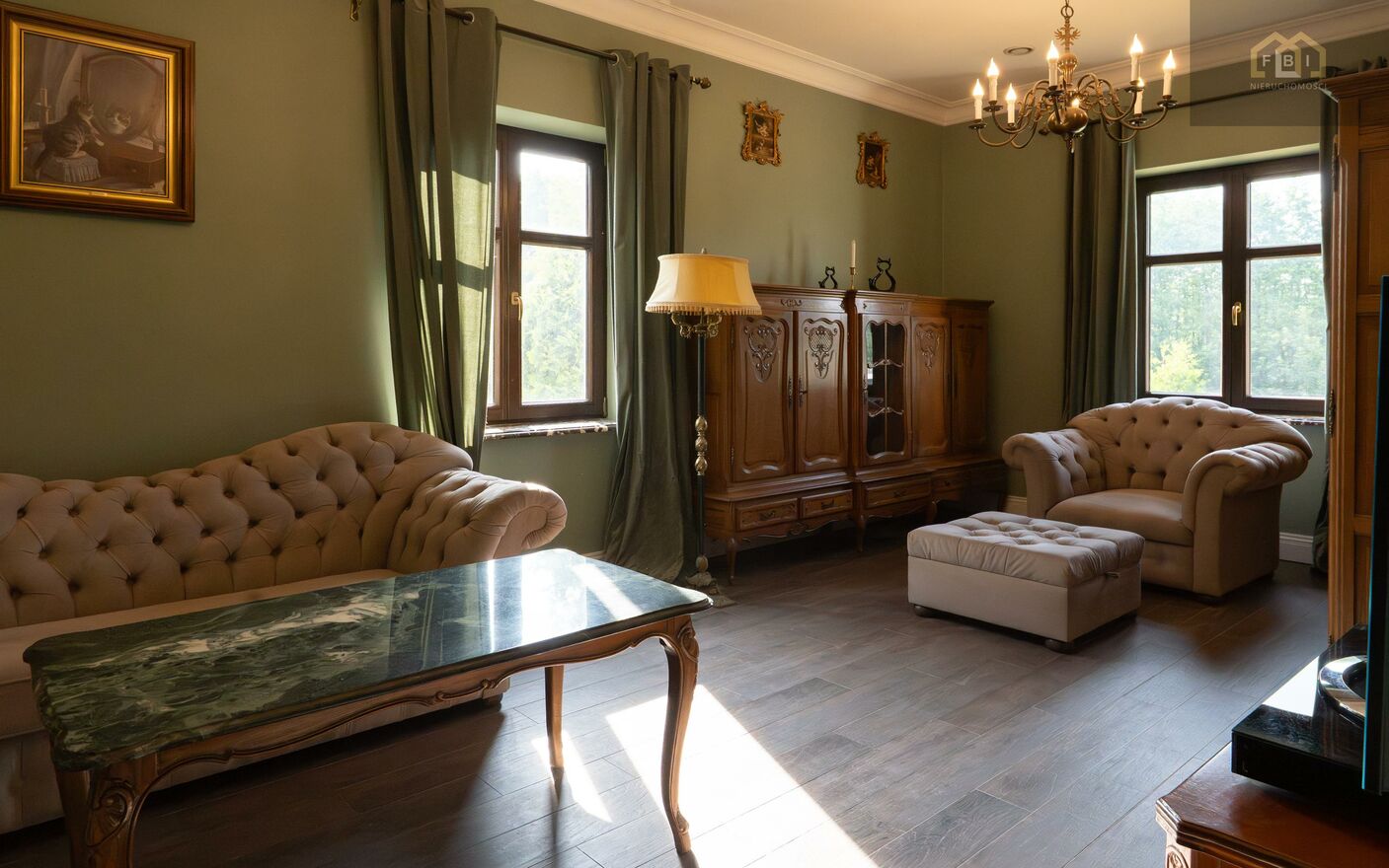 Antyczne drewniane meble oraz eleganckie tapicerowane sofy, fotele oraz krzesła nadają wnętrzom ponadczasowy styl. Uwagę przyciągają kunsztownie zdobione kominki oraz starannie dobrane dekoracyjne detale.